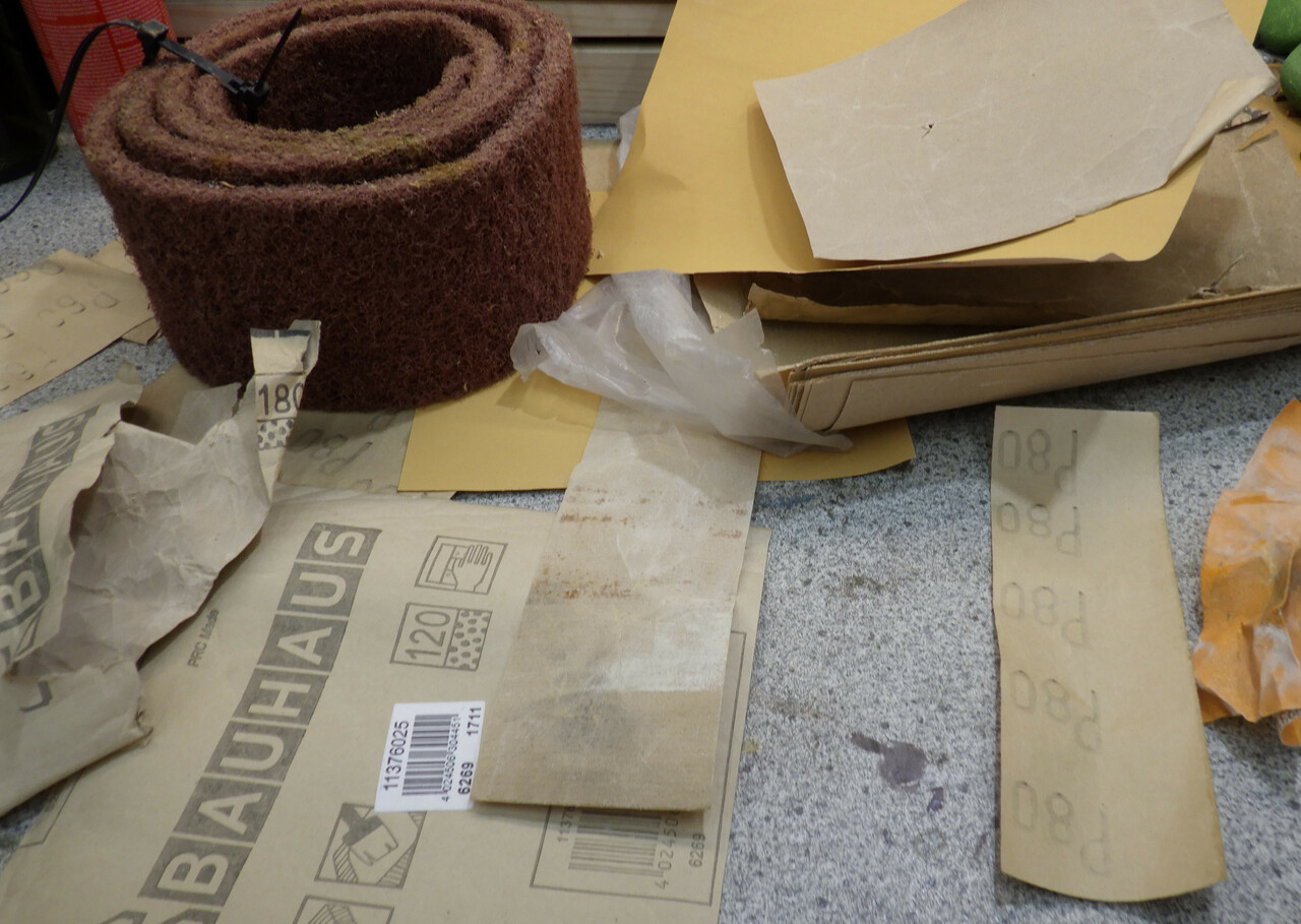 Den grossen Bosch Professional 220V Excenterschleifer (GET 75-150) hatte ich schon eine Weile - das erste Projekt bei dem ich den benutzt habe, war auch die Kueche in Gruissan. Bisher war der Bandschleifer (GBS 75 AE) mein Lieblingsschleifgeraet - der Excenterschleifer gefaellt mir jetzt aber noch besser. Das Geraet ist deutlich leichter und mit 3M Schleifgittern schleift es auch wirklich gut. Fuer kleine Kanten und Flaechen habe ich noch einen 125 mm 18V Akku-Excenterschleifer (GEX 18V-125 ) mitgenommen - mit der Kombination bin ich bei dem Kuechenprojekt gut zurecht gekommen.