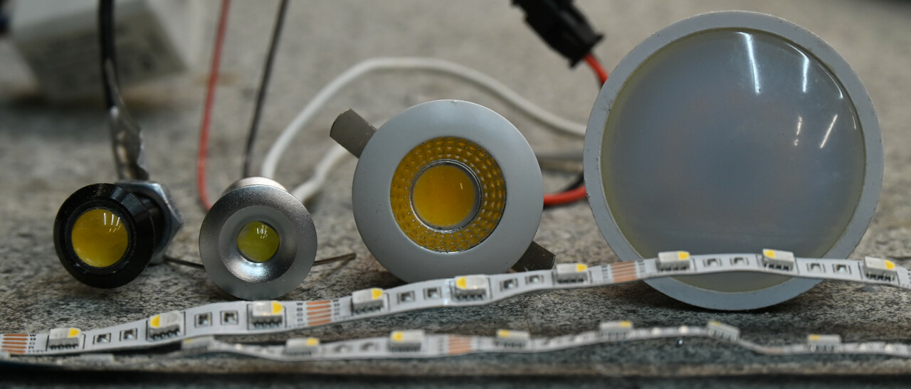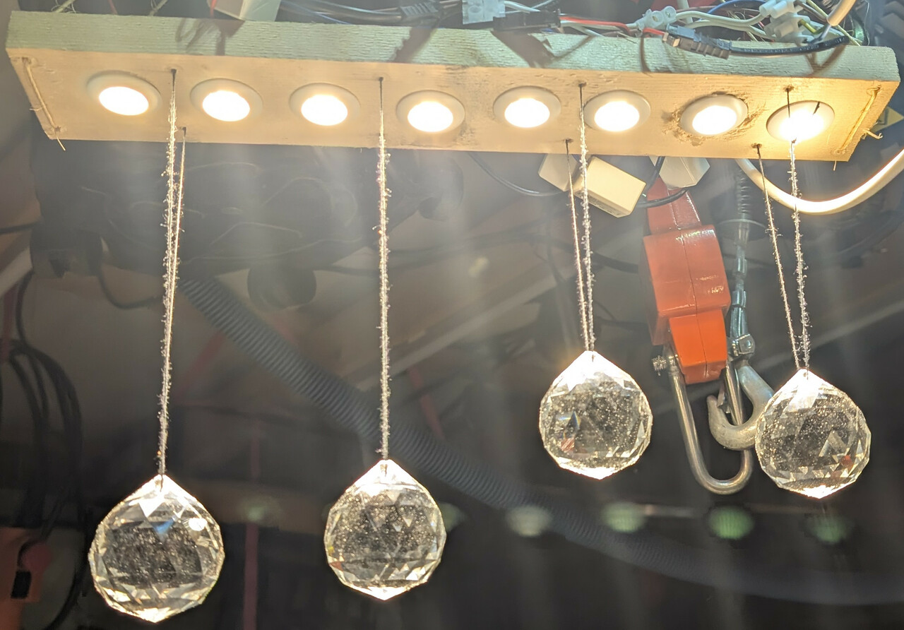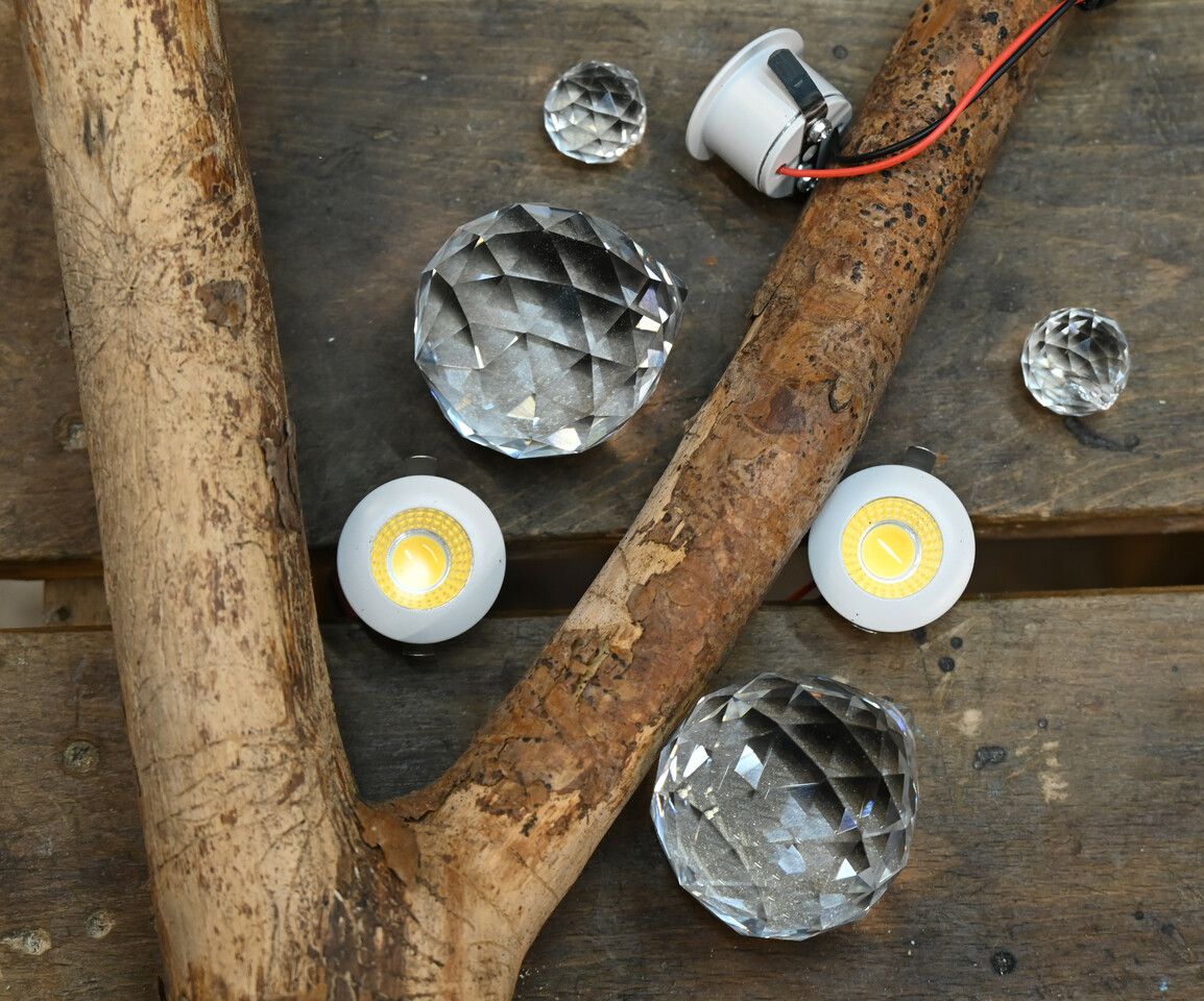 Bei den Kristallen haben mir geschliffene Glaskugeln mit 20 mm und 50 mm Durchmesser am besten gefallen. Die haenge ich an Angelschnur unter die Spots der Lampe. Spots waren etwas schwieriger auszuwaehlen - folgendes habe ich getestet :