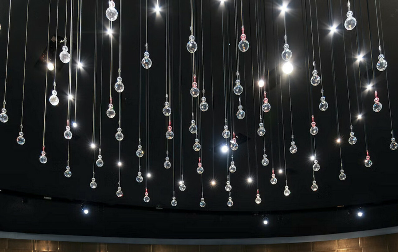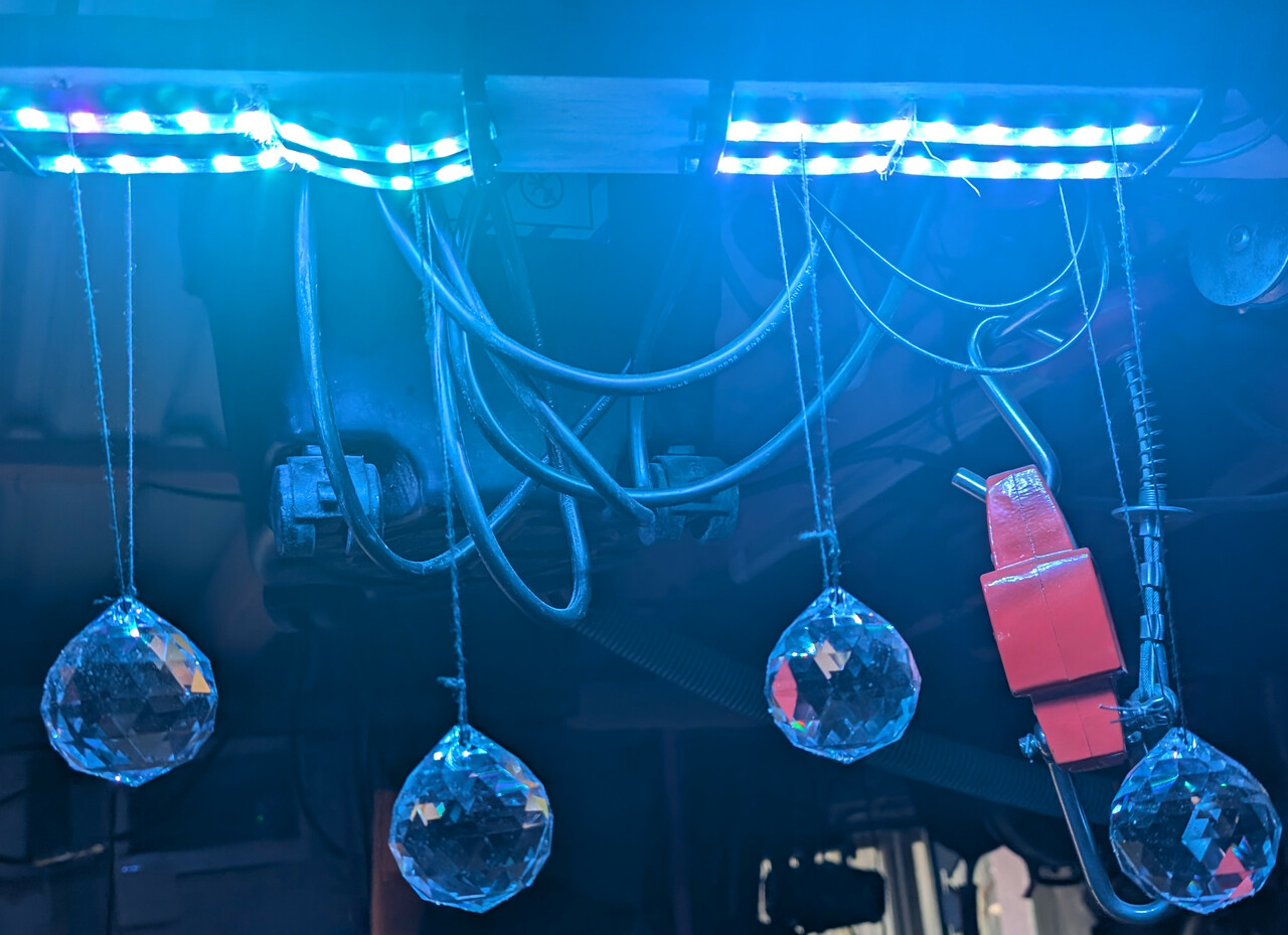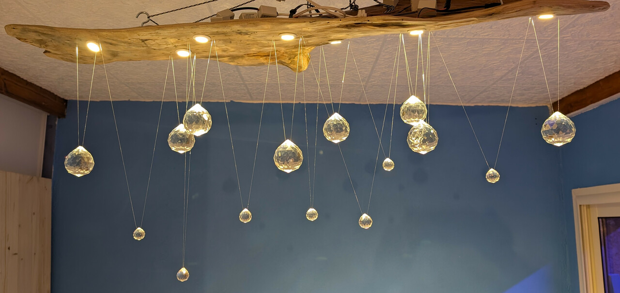 Das Treibholz habe ich dann mit 8 Spots, 8 grossen und 8 kleinen Kristallen bestueckt und an die Decke gehaengt. Es fehlt noch etwas Abdeckung nach oben fuer die Kabel - ansonsten ist das genauso geworden, wie wir uns das vorgestellt haben. Mit dem Vorbild im Museum hat der jetzt nicht mehr viel zu tun - aber das war auch eher ein Ideengeber.