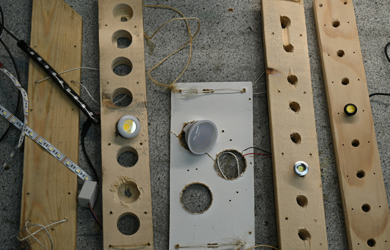 Antike Kronleuchter mit viel Glitzer und Gold sind total schoen, wenn sie in der passenden Umgebung haengen. Zum Beispiel im Casino Baden Baden - da passen die sehr gut hin. Ansonsten sehen sie eher kitschig und deplatziert aus. Es gibt aber auch moderne Kroneuchter - wir haben zufaellig im Mercedes Benz Musem in einem riesigen Raum mit Autos einen gesehen. Die Lampe dort hat Edelstahl statt Gold und ganz viele Kristalle, die von LED Spots angeleuchtet werden - das ergibt ein schoenes Lichterspiel im Raum. Fuer das Wohnzimmer in Gruissan wollte ich eh eine Lampe mit Treibholz bauen - also habe ich mal ein paar Kronleuchter Prototypen gebaut mit verschiedenen Lampen und Kristallen.