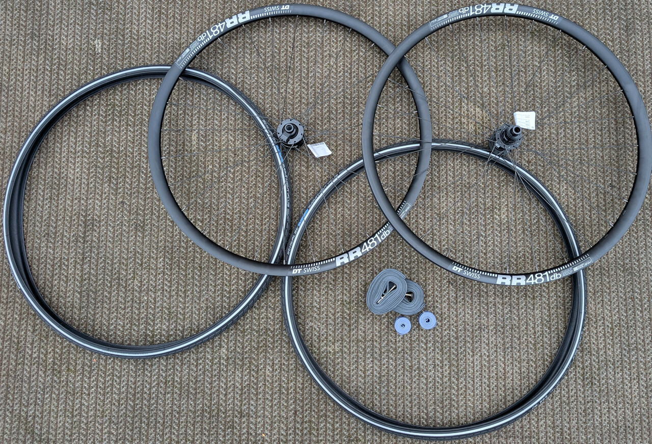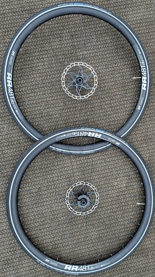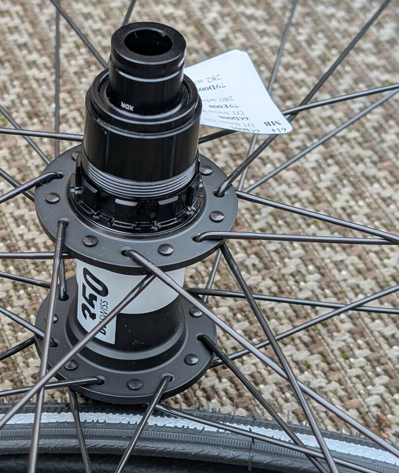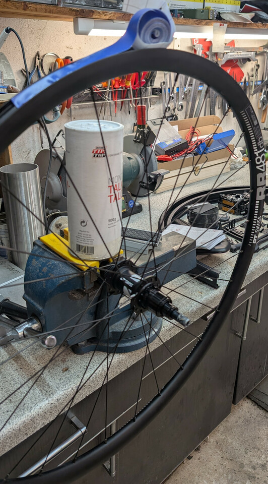 Der Support von Kurbelix hat mich sehr gut bei den Laufraeder beraten - die bieten so eine grosse Auswahl an, dass ich eine Weile gebraucht habe, bis ich mich zurecht gefunden habe. Es ist eine RR481 Felge (RR ist die Rennrad Serie) von DT Swiss geworden mit 25 mm Breite. Hinten eine DT Swiss 350 Nabe, Ratchet Freilauf, Centerlock und XDR Aufnahme und vorne den Shutter Precision Nabendynamo mit Centerlock Bremsscheibenaufnahme. Das ganze mit Messingnippeln und konischen schwarzen Speichen - sehr schick. Die Raeder werden extra gebaut - es hat eine Woche gedauert, bis ich das hier hatte.