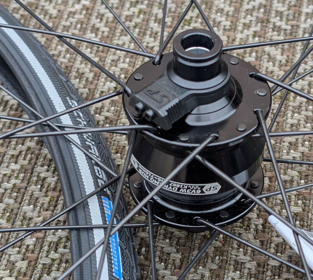 Es ist auch gar nicht so einfach passende Laufraeder zu finden. Es gibt von DT Swiss einen Laufradsatz mit dem Shutter Precision Dynamo - beim G1800 werden aber nur Maentel ab 30 mm Breite unterstuetzt - das ist fuer ein Stadtrad viel zu viel. Ausserdem hat es keinen Ratchet Freilauf. Es gibt auf der anderen Seite tausende Kombinationen von Felgen, Speichen und Naben - die groesste Auswahl habe ich bei Kurbelix gefunden.